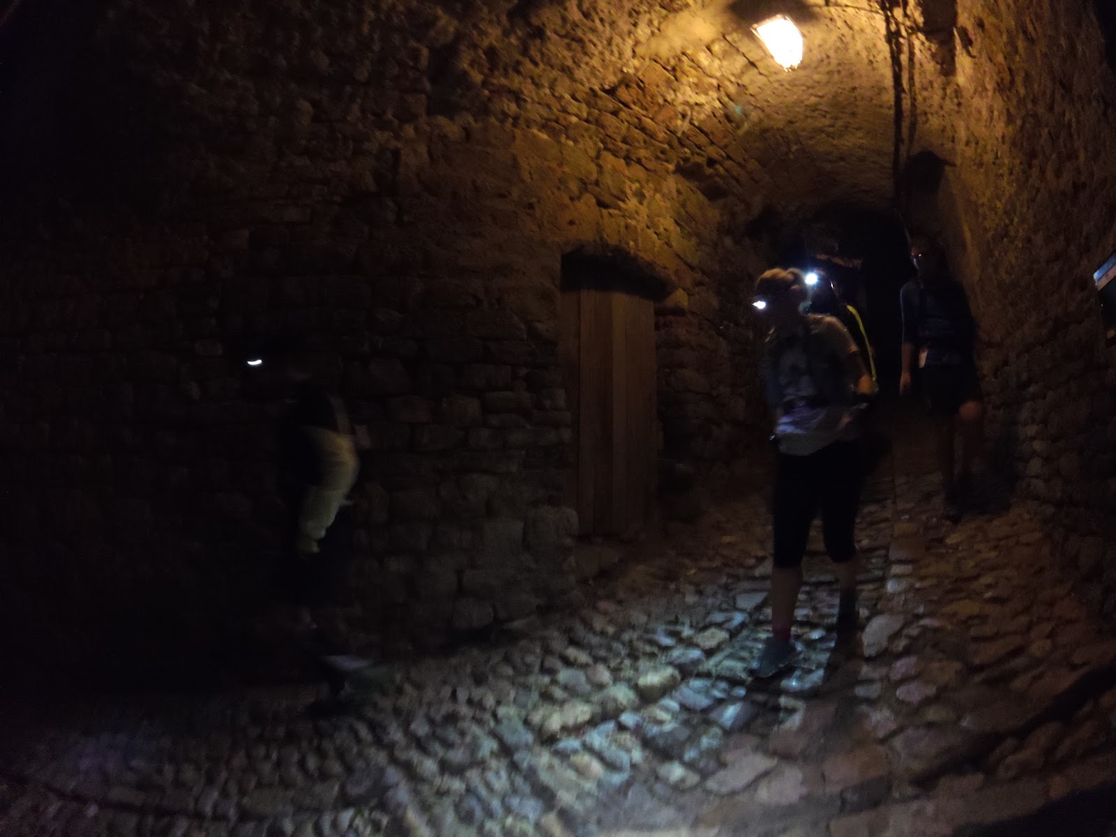 7h : Départ de la course je suis surprise le speaker est assez discret (il n'y a pas de sono ni de musique) il donne le départ et un peu plus de 330 coureurs s'élancent à l'assaut de l'intégrale. On démarre par une petite descente en route avant d'entamer une première petite montée où chacun y va bon train en rigolant ça fait du bien pour évacuer ce satané stress, nous arrivons à un ptit village charmant et très typique, de nuit c'est encore plus fabuleux. Je suis concentrée et surtout attentive à chaque pose de pas dans la descente avec les pavés car je pars avec un ptit handicap de ma cheville gauche ainsi qu'une ancienne tendinite difficile à guérir ! Kévin a pourtant bien réussi à limiter les dégâts !! merci à toi !